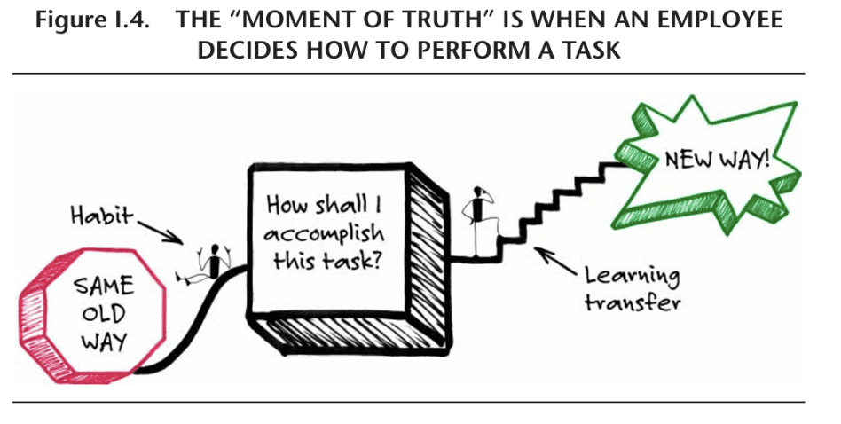 The moment of truth occurs when an employee has the opportunity to apply the new knowledge and skill in the course of his or her work. Employees have two choices (Figure I.4): com plete the task in the new way they just learned, or continue to perform as before (same old way), which might be to do nothing at all. If they choose to perform in the new (andpresumably better) manner, then the learning creates value. If they persist (or revert) to performing in the way that they had previously, then the learning is of no value, perfor mance won’t improve, and the investment in learning was a waste of time and resources.