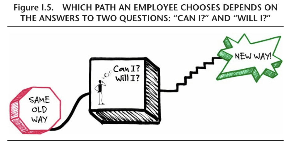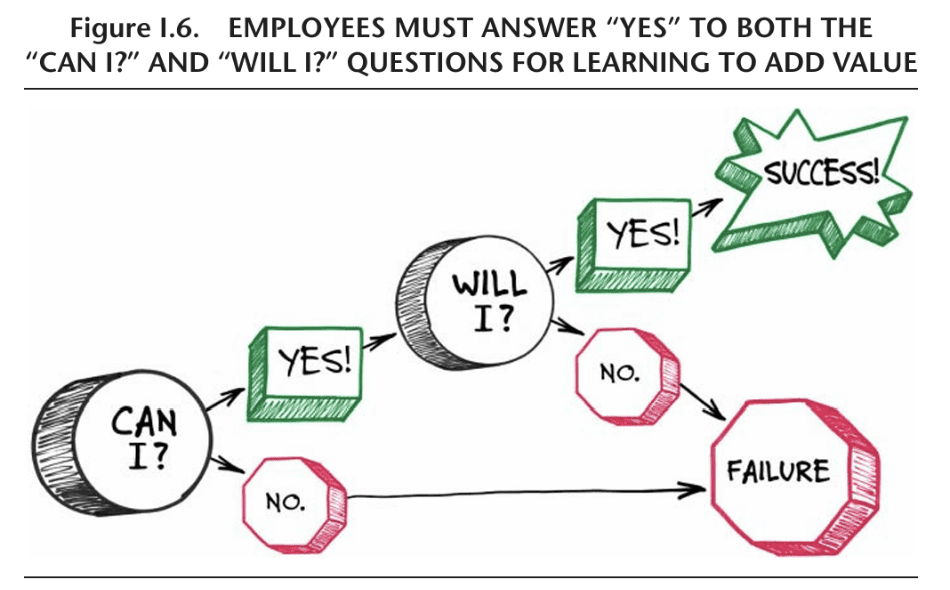 Which path an employee chooses depends on the answers to two crit ical questions: “Can I do it the new way?” and “Will I make the effort?” (Figure I.5). It makes no difference how much an employee learned or how the knowledge was obtained; unless he or she answers “Yes, I can” and “Yes, I will” at the moment of truth, the learning adds no value to the organization.